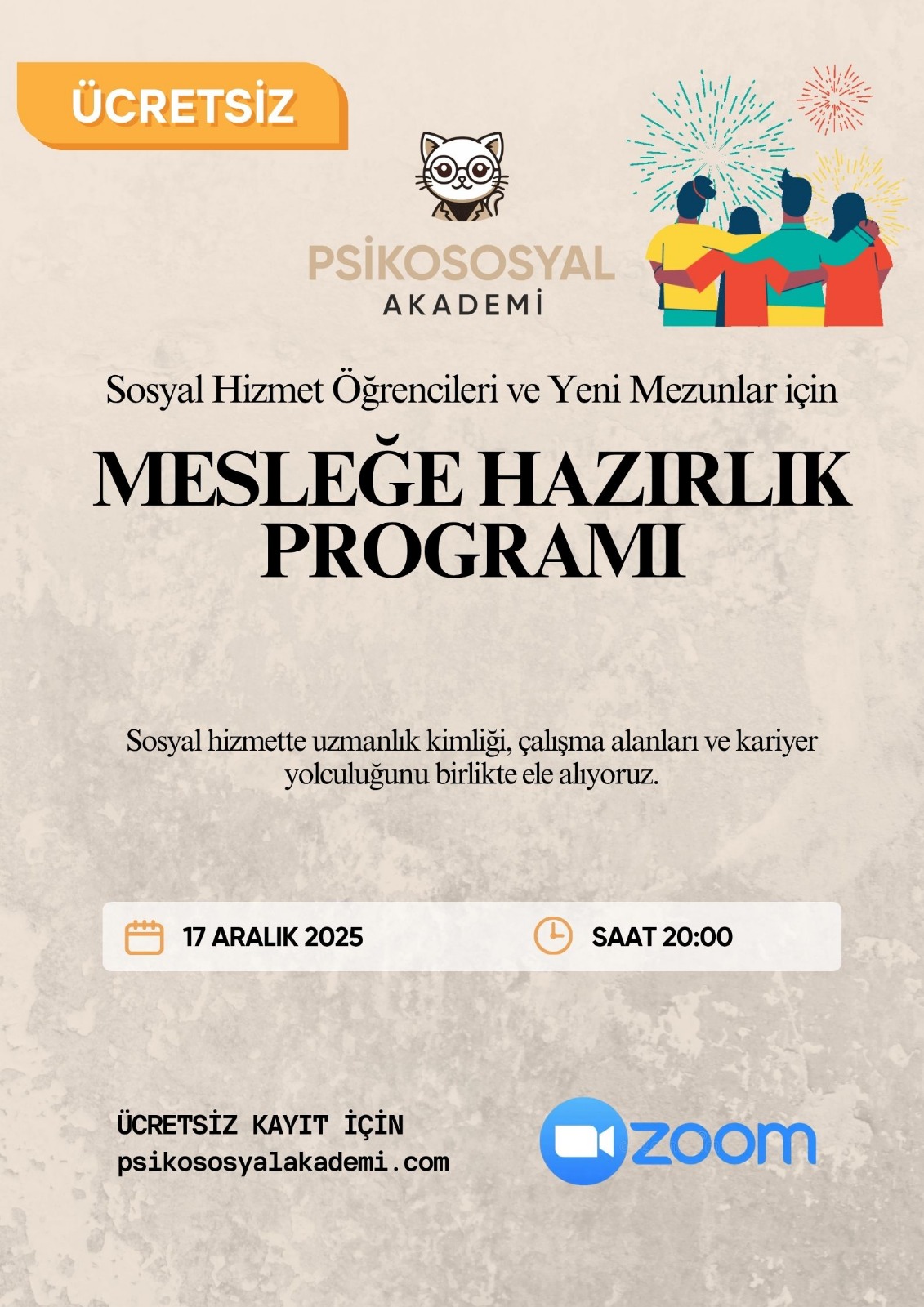Psikososyal Akademi, sosyal hizmet öğrencileri ve yeni mezunlarına, mesleğe adım atarken profesyonel kimliklerini güçlendirmeleri ve sahada kendilerini konumlandırmaları için rehberlik ediyor.